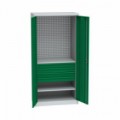 Kovové dílenské skříně vybaveny policemi s nosností 100 kg a zásuvkami pro efektivní využití v provozech a dílnách. Robustní svařovaná ocelová konstrukce s nosností až 1,5 tuny, povrchová úprava práškovým lakem. Vyztužené křídlové dveře s perforovanou vnitřní stranou pro uložení nářadí. Tříbodový cylindrický rozvorový zámek se dvěma klíči. Pozinkované police výškově nastavitelné v rastru 25 mm. Zásuvky s nosností 75 kg a 100% výsuvem na válečkových ložiskách.Dílenské skříně se zásuvkami Bott Cubio, výška 100 cm