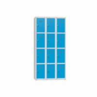 Plechové šatní skříně s 12 boxy pro uložení drobných osobních věcí. Dveře jednotlivých boxů jsou uloženy na vnitřních pantech s úhlem otevření více než 90°. Šatníky jsou standardně vybaveny cylindrickým zámkem pro každou buňku. Součástí jsou plastové háčky pro zavěšení uschovaných věcí. Větrací otvory ve dvířkách. K dostání ve třech barevných variantách.Kovové šatní skříně, 12 boxů, 1850 x 900 x 500 mm, šedá