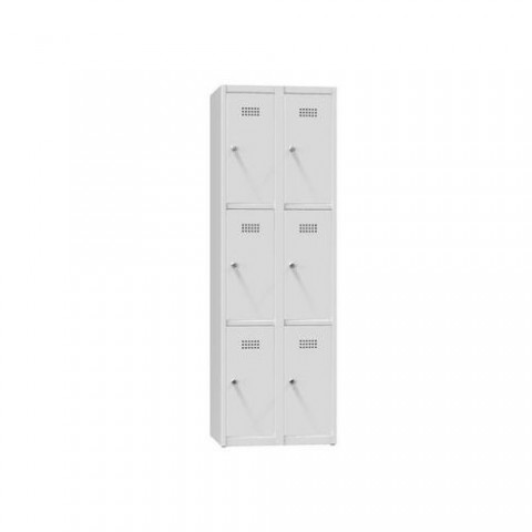 Plechové šatní skříně pro uložení drobných osobních věcí. Dveře jednotlivých boxů jsou uloženy na vnitřních pantech s úhlem otevření více než 90°. Šatníky jsou standardně vybaveny cylindrickým zámkem pro každou buňku (možnost zámku s cylindrickou vložkou nebo uzávěru pro visací zámky). Součástí jsou plastové háčky pro zavěšení uschovaných věcí. Větrací otvory ve dvířkách. K dostání ve třech barevných variantách.Kovové šatní skříně, 6 boxů, 1850 x 600 x 500 mm, šedá