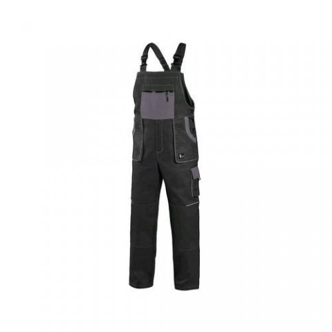 Černé pánské montérky s laclem s šedými doplňky. Náprsní kapsa na zip, velké přední a menší boční kapsy schovají telefon, metr a další drobné předměty potřebné k práci. Zdvojená vyztužená partie kolen pomůže při častém klečení. Kšandy do gumy se zapínáním na plastovou přezku.Pánské montérkové kalhoty CXS s laclem, černé/šedé