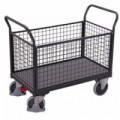 Manipulační vozík s pevnou ocelovou konstrukcí, velkou ložnou plochou a čtyřmi mřížovými stěnami. Ložná plocha je vyrobena z laminované dřevotřísky. Stěny jsou vysoké 77 cm, boční lze odejmout, čelní stěny jsou pevné. Pohyb zajišťují čtyři dušová kola s valivými jehlovými ložisky, z nichž dvě jsou pevná a dvě otočná. Kola jsou široká 85 mm a jsou vybavena ochrannými kryty. Zvednutím táhla dojde k zabrzdění předních otočných kol. Povrchová úprava práškovým lakem.Ruční plošinový vůz se čtyřmi stěnami s mřížovou výplní, do 600 kg