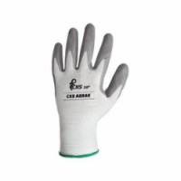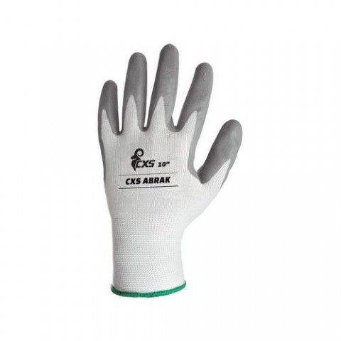 Povrstvené pracovní rukavice z polyesteru vysoce odolné proti prodření. Vrstva nitrilu pokrývá dlaň a prsty.Polyesterové rukavice CXS polomáčené v nitrilu, šedé/bílé