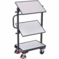 Antistatický policový vozík se třemi policemi. Ložná plocha z elektricky vodivé laminátové dřevotřísky. Police jsou vsazené do ocelového rámu a lze je vyjímat. 2 pevná a 2 otočná kola s brzdou EasySTOP. Šedá kola z termoplastické pryže nezanechávající stopy na plastovém ráfku s přesnými kuličkovými ložisky.Policové vozíky ESD, 3 police, do 250 kg