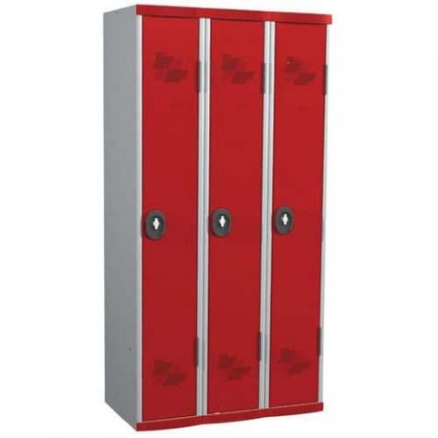 Svařovaná šatní skříň z odolného profilovaného ocelového plechu o tloušťce 0,6 mm (odpovídá 0,8 mm standardnímu). Odolná dvířka se otevírají až do úhlu 180°. Perforace ve dveřích i konstrukci skříně pro lepší odvod vlhkosti. Možnost umístění štítku se jménem. Uzamykání na visací zámek (není součástí dodávky, doporučený průměr třmenu 6 až 7 mm).Svařované šatní skříně Acial, 3 oddíly, 300 mm, otočný uzávěr
