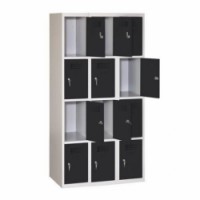 Svařované boxové skříně s odlehčenou konstrukcí a výztuhami zajišťujícími dobrou stabilitu. Vhodné pro odkládání osobních věcí na pracovištích, kulturních akcích, v převlékárnách apod. Vyrobeno z ocelového plechu tloušťky 0,5 mm. Perforovaná dvířka zajišťují účinné odvětrávání vnitřního prostoru. Dvířka jsou zavěšena na vnitřních pantech. Jednotlivé boxy jsou samostatně uzamykatelné cylindrickým zámkem s možností výměny za otočný uzávěr (nutno dokoupit zvlášť). Vnitřní prostor boxů je hladký a snadno udržovatelný. Možnost umístění štítku se jménem.Svařované šatní skříně Eric odlehčené, 12 boxů, cylindrický zámek