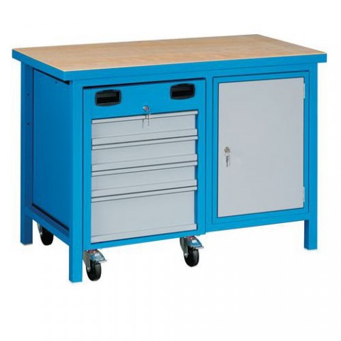 Pracovní svařovaný stůl Rivt s uzamykatelnou skříňkou se dvěma policemi je vybaven kontejnerem, který lze díky kolečkům přemístit, aby byl kdykoliv po ruce. Kontejner má čtyři plně výsuvné zásuvky, kde první tři jsou vybaveny děliči pro snadnou organizaci obsahu.Svařovaný dílenský stůl Rivt, 85 x 120 x 60 cm