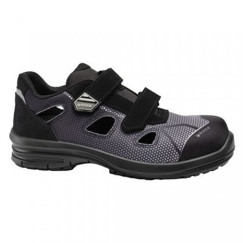 S1 PL ESD sandál SRC Nízká obuv; černá/šedá; Voděodolná technická textilie a semišová kůže; Podšívka SmellStop; Textilní stélka Fresh'n Flex odolná proti propíchnutí; SlimCap špička; Mono PU podrážka; 200 joulů odolná špička Absorpce nárazů v oblasti paty Antistatická obuv Podešev odolná proti propíchnutí Odolné vůči uhlovodíkům SR - Protiskluzová keramika a glycerin Vhodné pro použití v prostředí ESD Nekovové Ortopedická vložka vyhovující evropským normám DGUV112-191SYRIUS, černá/šedá