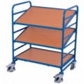Vychystávací vozík se třemi policemi bez ložné plochy. Do kovových rámů polic lze vsadit přepravky o rozměru 600 x 400 mm. Nosnost horní a střední police 50 kg. Pojízdnost zajišťují dvě pevná a dvě otočná kola z termoplastické pryže na plastovém ráfku s kuličkovými ložisky, nezanechávají stopy na podlaze.Vozíky na přepravky bez ložné plochy, 3 police