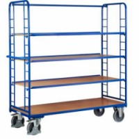 Vozík se čtyřmi policemi z MDF desky vhodný pro přepravu materiálu a předmětů. Horní výškově stavitelné police se sklonem 15° jsou přestavitelné v rastru 12 cm. Jednoduchá manipulace pomocí kovového madla. Pohyb zajišťují čtyři kola s valivými kuličkovými ložisky, z nichž dvě jsou pevná a dvě otočná s brzdou a ochrannými kryty. Vozík je opatřen TUV certifikátem.Vysoké policové vozíky s madlem a šikmými policemi, 4 police