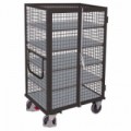 Vysoké policové vozíky s 5 policemi jsou vhodné pro bezpečnou přepravu a uskladnění zboží. Vozík lze uzamknout pákovým zámkem. Police jsou vyrobené z MDF desky, čtyři z nich jsou odnímatelné a přestavitelné v rastru 10 cm. Vozíky jsou opatřené mřížovými bočnicemi s oky velikosti 5 x 5 cm. Pohyb zajišťují čtyři kola s valivými kuličkovými ložisky, z nichž dvě jsou pevná a dvě otočná s brzdou Easy Stop a ochrannými kryty.Vysoké uzavíratelné skříňové vozíky s madlem a mřížovými stěnami, do 500 kg, 5 polic