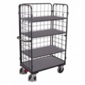 Policový vozík s mřížovými čely (oka 120 x 120 mm) a 4 policemi. Ruční brzda, která při uvolnění okamžitě zastaví celý vozík (dead man's brake). Vyjímatelné police vyrobené z MDF desek, nastavitelné v krocích po 120 mm. 2 otočná a 2 pevná kola. Šedá kola z termoplastické pryže nezanechávající stopy na plastovém ráfku s přesnými kuličkovými ložisky.Policové vozíky s mřížovými bočnicemi a ruční brzdou, 4 police