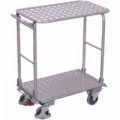 Skládací vozík s hliníkovou konstrukcí a policemi s diamantovým dezénem. Spodní ložná plocha je použitelná i se složenou horní policí Nosnost polic 70 kg. Pohyb zajišťují 4 otočná kola s valivými kuličkovými ložisky, z nichž dvě jsou opatřeny brzdou.Skládací hliníkový policový vozík, do 150 kg, 2 police, 97 x 89 x 45 cm