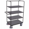 Vysoké policové vozíky se čtyřmi policemi a dvěma mřížovými bočnicemi. Police jsou vyrobeny z laminátu, tři z nich jsou výškově stavitelné. Pohyb zajišťují čtyři kola s valivými jehlovými ložisky, z nichž dvě jsou pevná a dvě otočná. Povrchová úprava pozinkováním.Vysoké policové vozíky s madlem a mřížovými bočnicemi, do 300 kg, 4 police