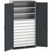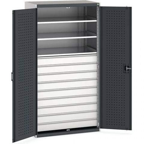 Kovové dílenské skříně vybaveny policemi s nosností 100 kg a zásuvkami pro efektivní využití v provozech a dílnách. Robustní svařovaná ocelová konstrukce s nosností až 1,5 tuny, povrchová úprava práškovým lakem. Vyztužené křídlové dveře s perforovanou vnitřní stranou pro uložení nářadí. Tříbodový cylindrický rozvorový zámek se dvěma klíči. Pozinkované police výškově nastavitelné v rastru 25 mm. Zásuvky s nosností 75 kg a 100% výsuvem na válečkových ložiskách.Dílenské skříně se zásuvkami Bott Cubio, výška 200 cm