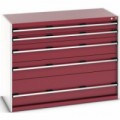 Zásuvkové skříně Bott Cubio se zásuvkami s nosností 200 kg a 100% výsuvy na válečkových ložiskách. Robustní svařovaná ocelová konstrukce s nosností až 1,5 tuny, povrchová úprava práškovým lakem. Systém centrálního zámku i blokace otevření více zásuvek najednou. Ergonomické rukojeti s popisovatelnou lištou, uzamykání cylindrickým zámkem se dvěma klíči.Dílenské zásuvkové skříně Bott Cubio 200, 100 x 130 x 65-75 cm, 5 zásuvek