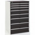 Zásuvková skříň je opatřená mechanismem centrálního zamykání a blokace zásuvek. Zásuvky jsou základním skladovacím prvkem, a proto splňují vysoké požadavky na pevnost a stabilitu. Korpusy zásuvkových skříní tvoří svařenec jednotlivých konstrukčních dílů z kvalitních ocelových plechů. Vnitřní konstrukce korpusů je opatřena perforací po 25 mm. Tuto perforaci využíváme k uchycení vodicích lišt zásuvek, jejich výškovému uspořádání a nakonfigurování požadované zásuvkové sestavy. Přestavování vodicích lišt nebo háčků polic probíhá jednoduše a velice rychle bez použití nástrojů.Zásuvkové skříně ZE8, 578 x 753 x 840 mm