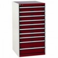 Zásuvkové skříně Bott Cubio se zásuvkami s nosností 75 kg a 100% výsuvy na válečkových ložiskách. Robustní svařovaná ocelová konstrukce s nosností až 1,5 tuny, povrchová úprava práškovým lakem. Systém centrálního zámku i blokace otevření více zásuvek najednou. Ergonomické rukojeti s popisovatelnou lištou, uzamykání cylindrickým zámkem se dvěma klíči.Dílenské zásuvkové skříně Bott Cubio, 120 x 65 x 52,5-75 cm, 10 zásuvek