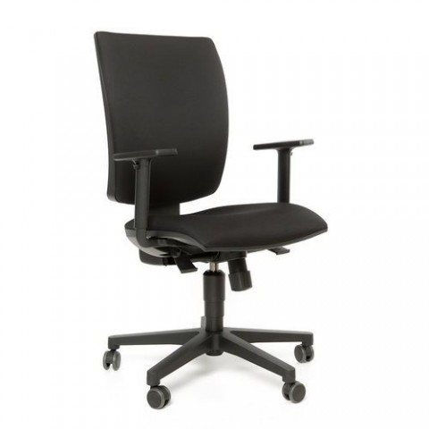 Kancelářská židle Lyra v celočalouněném černém provedení. Sedák i opěrák je potažen látkou ERA. Vysoká zádová opěrka je opatřená systémem UP-DOWN (plynulým zvedáním zádové opěrky dochází ke zvolení požadované výšky a jejímu okamžitému aretování ve zvolené poloze). Součástí židle jsou výškově stavitelné područky s plastovými podloketkami. Židle disponuje synchronní mechanikou s nastavením tuhosti odporu pod sedákem centrálním šroubem. 5 pozic pro uzamčení sklonu sedáku a opěráku. Hloubkově nastavitelný sedák.Kacelářská židle Lyra