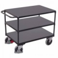 Etážové vozíky se třemi policemi vhodné do skladů pro transport materiálu a zboží. Police vyrobené z MDF desek jsou připevněné ke kovové konstrukci, která převyšuje horní polici a slouží tak zároveň jako manipulační madla. Pojezd zajišťují čtyři kola s valivými kuličkovými ložisky, z nichž dvě jsou pevná a dvě otočná s brzdou Easy Stop a ochrannými kryty.Policové vozíky, do 250 kg, 3 police