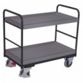 Antistatické vozíky se dvěma policemi vhodné do prostor, kde je nutné předcházet elektrickým výbojům. Police vyrobené z MDF desek jsou zasazené do kovových rámů vozíku. Mobilitu zajišťují čtyři kola s valivými kuličkovými ložisky, z nichž dvě jsou pevná a dvě otočná s brzdou Easy Stop a ochrannými kryty.Antistatické policové vozíky s madlem, do 250 kg, 2 police