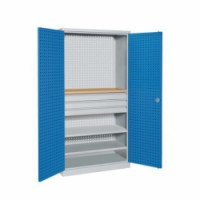 Svařovaná dílenská skříň s plně výsuvnými zásuvkami a perforacemi pro uchycení nářadí. Dveře a zadní strana jsou perforované pro háčky na nářadí (čtvercové otvory 10 x 10 mm, rozteč 38 mm). Uzamykání dvoubodovým rozvorovým cylindrickým zámkem. Skříň lze připevnit k zemi a ke zdi pomocí montážních otvorů.Kovové dílenské skříně Sofame, 195 x 100 x 45 cm, šedé/modré