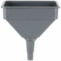 Čtvercový trychtýř s vyměnitelným mosazným sítem. Ochrana proti stříkající vodě díky širokému okraji. Vysoká odolnost vůči oleji, kyselinám a palivu. S rovným výtokovým hrdlem.Plastový trychtýř Pressol se sítem