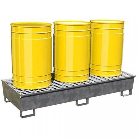 Záchytná nádrž pro vertikální skladování sudů s toxickými, znečišťujícími a hořlavými produkty. Zařízení z ocelového plechu, trubek a úhelníků. Ekonomický výrobek. Vodotěsné svařování a těsnění, továrně kontrolované.Ocelové záchytné vany s roštem - Manutan Expert, pro 3 sudy