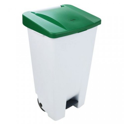 Plastové odpadkové koše s barevnými víky vhodné do potravinářských prostorů. Koše jsou opatřené dvěma kolečky a madlem na zadní straně. Hygienické otevírání víka nášlapným systémem na přední straně koše.Plastové odpadkové koše Manutan Expert Handy, objem 120 l
