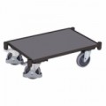 Transportní plošina vhodná pro umístění přepravek o rozměru 600 x 400 mm. Ložná plocha z MDF desky, okraj 10 mm. Čtyři otočná kola, z nichž dvě jsou opatřená brzdou. Šedá kola z termoplastické pryže nezanechávající stopy na plastovém ráfku s přesnými kuličkovými ložisky, ochrana nohou.Transportní plošiny, do 250 kg, 10mm hrana, 61 x 41,5 x 20,5 cm