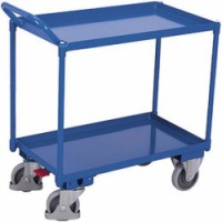 Policový vozík se dvěma kovovými vanovými policemi s 40mm hranou. 2 pevná a 2 otočná kola s brzdou EasySTOP. Šedá kola z termoplastické pryže nezanechávající stopy na plastovém ráfku s přesnými kuličkovými ložisky.Policové vozíky s kovovými policemi, 2 police, do 400 kg