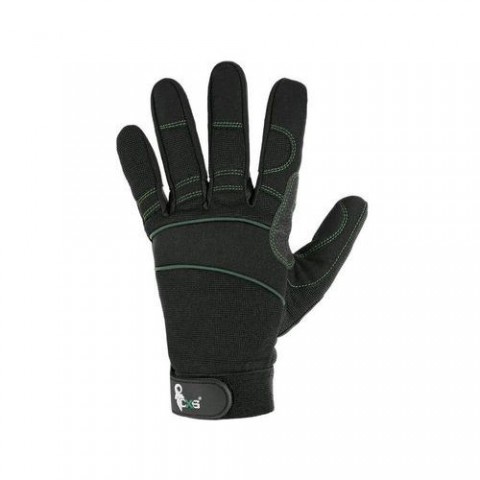 Kombinované pracovní rukavice ze tří různých materiálů pro dokonalé přizpůsobení se ruce a pohodlné nošení. Pevná syntetická kůže na dlani odolává srážení, natahování a tvrdnutí. Hřbet ruky vyroben ze strečového Spandexu a oblast kloubů zpevněna neoprenem.Rukavice CXS ze syntetické kůže, černé