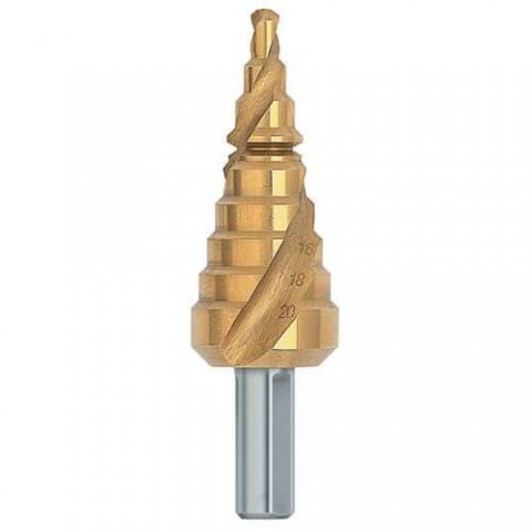 Povlak TIN pro větší odolnost a zabránění ulpívání třísek. Třísky odváděné šroubovitými drážkami. Stupňovitý vrták, který snadno proniká do materiálu. Vrtání a odstraňování otřepů na obou stranách plechu v jednom úkonu.Stupňovité vrtáky