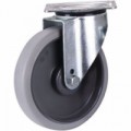 Otočná pojezdová kola z šedé termoplastické pryže na plastovém ráfku s přesnými kuličkovými ložisky. Šedý nešpinivý běhoun. Nízká hlučnost, nízký válivý odpor. Vysoká odolnost vůči chemikáliím (oleje, plyny, kyseliny, rozpouštědla a organické látky). Odolnost vůči teplotám od -20 do +80 °C, vysoká odolnost vůči opotřebení. Tvrdost 65° Shore A.Termoplastická pojezdová kola s přírubou, průměr 125 - 200 mm, kuličkové ložisko, otočná