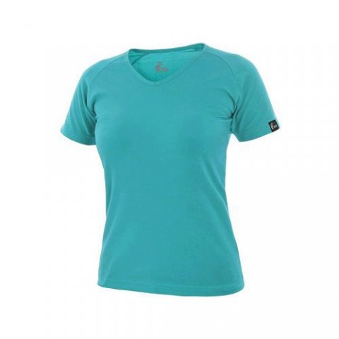 Dámské tričko s průkrčníkem do V. Krátký rukáv raglánového typu. Střih zvýrazňující dámskou postavu a elastan pro pružnost a dlouhodobé udržení tvaru. Finální silikonová úprava materiálu, která zajišťuje vyšší měkkost, rozměrovou stálost a omezuje žmolkovatění. Saténová etiketa. Vhodné pro potisk a výšivku. Velikost: XS-XXLTričko ELLA, dámské, tyrkysové