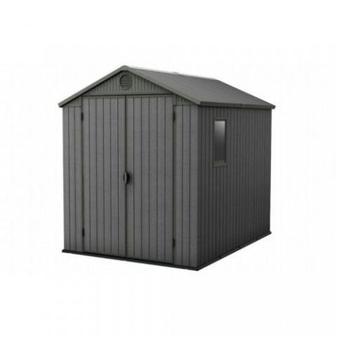 Bezúdržbové domky na nářadí, sekačky, kola, grily a jiná zařízení na zahradu. Robustní konstrukce s ocelovými výztuhami a dvojitými stěnami vyrobená z materiálu Evotech (dřevo-plast), který je velmi odolný vůči povětrnostním vlivům. Kvalitní podlahové panely udržuji nářadí a stroje v suchu a čistotě, lze uložit i těžší vybavení jako jsou sekačky či čtyřkolky aj. Dvojité široké dveře pro jednoduchou manipulaci se stroji. Postranní okno zajišťuje dostatek světla uvnitř domku. Pod střechou jsou umístěné větrací otvory pro cirkulaci vzduchu. Vnitřní rozměry jsou 212 x 234 x 174 cm.Zahradní domek Darwin 6 x 8, hnědý